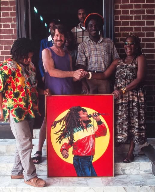 Rita Marley gets gifted a Bob Marley painting at The Bob Marley Museum in Kingston, Jamaica. Rohan Marley is also on the left. (1995)